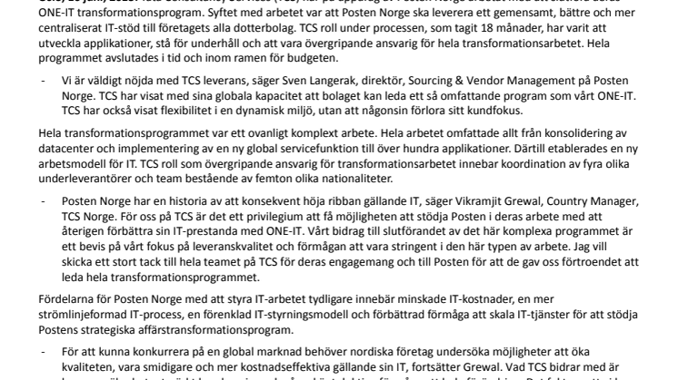 -Posten Norge har en historia av att konsekvent höja ribban gällande IT, säger Vikramjit Grewal, Country Manager, TCS Norge. För oss på TCS är det ett privilegium att få möjligheten att stödja Posten i deras arbete med att återigen förbättra sin IT-prestanda med ONE-IT. Vårt bidrag till slutförandet av det här komplexa programmet är ett bevis på vårt fokus på leveranskvalitet och förmågan att vara stringent i den här typen av arbete. Jag vill skicka ett stort tack till hela teamet på TCS för deras engagemang och till Posten för att de gav oss förtroendet att leda hela transformationsprogrammet.