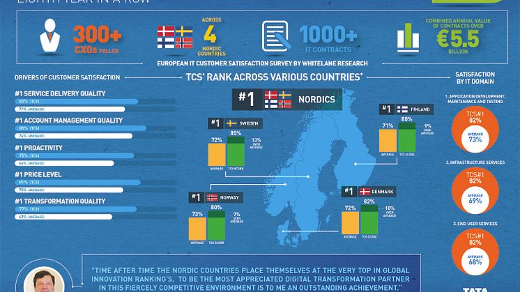 Med en kundnöjdhet på 81 procent har TCS:s kunder rankat företaget som nummer ett av it-tjänsteleverantörerna i Norden för elfte året i rad, enligt en undersökning utförd av Whitelane Research. TCS har dessutom blivit högst rankade bland it-tjänsteleverantörer i Sverige, med 82 procent i generell kundnöjdhet.