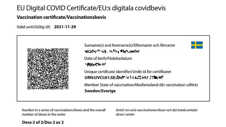 Vaccinationsbeviset gäller under 90 dagar från det datum som det har hämtats ut. Därefter behövs ett nytt vaccinationsbevis hämtas ut.