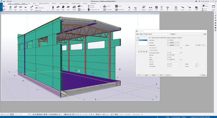 Genomskärning av Tekla-modell över stålhall med platta på mark och sandwichelementväggar. Grundisolering har modellerats med verktyget Floor layout. Det har inställningen Auto-cut och isoleringen klipps automatiskt när det krockar med t.ex betong.