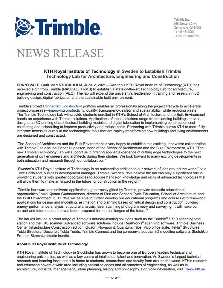 Kungliga Tekniska högskolan, KTH, i Stockholm är nu ett av 20-talet lärosäten i världen som sedan 2016 har tillägnats ett eget Trimble Technology Lab, där en stor del av Trimbles program- och hårdvaror för byggkonstruktion, infrastruktur och avståndsmätning erbjuds. Ett nära samarbete mellan akademi och industri är viktigt för att framgångsrikt förbereda framtida experter inom arkitektur, teknik och konstruktion. Teknologilabbet blir därmed Trimbles bidrag till den teknologiska utvecklingen i byggsektorn.