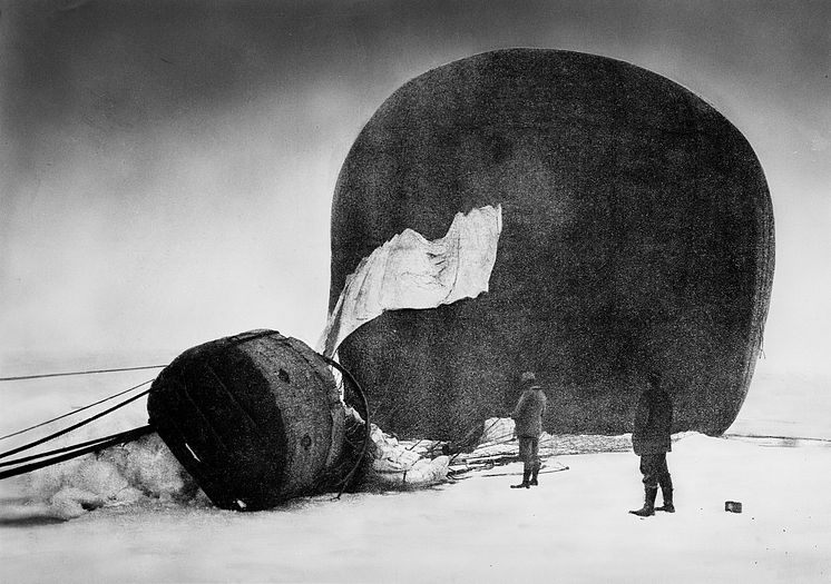 Andrées polarexpedition 1897. Luftfärden slutade på isen den 14 juli. Strax efter landningen avbildade expeditionens fotograf Nils Strindberg ännu en gasfylld ballong.