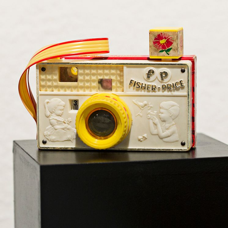 Leksakskamera Fisher - Price skänkt till Tekniska museet av Masoud Emadén som samlat på sig leksakskameror i mer än 30 år under resor och på auktioner.