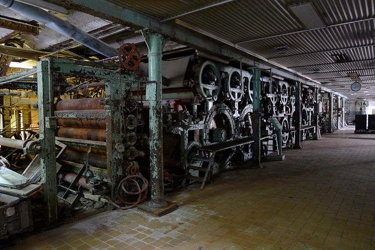 Pappersmaskinen PM 1 från 1906 står kvar på̊ ursprunglig plats. Foto: Eric Julihn 2011 CCBYSA