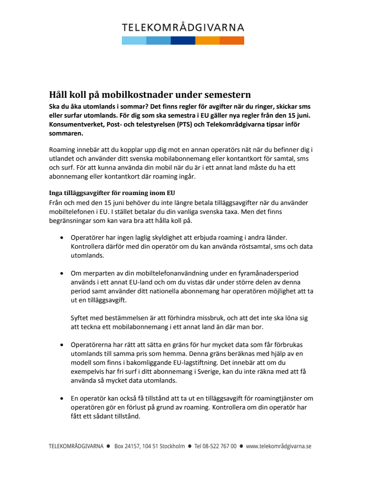 Ska du åka utomlands i sommar? Det finns regler för avgifter när du ringer, skickar sms eller surfar utomlands. För dig som ska semestra i EU gäller nya regler från den 15 juni. Konsumentverket, Post- och telestyrelsen (PTS) och Telekområdgivarna tipsar inför sommaren.
