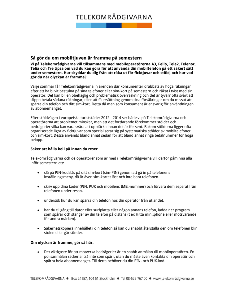 Vi på Telekområdgivarna vill tillsammans med mobiloperatörerna A3, Fello, Tele2, Telenor, Telia och Tre tipsa om vad du kan göra för att använda din mobiltelefon på ett säkert sätt under semestern. Hur skyddar du dig från att råka ut för ficktjuvar och stöld, och hur vad gör du när olyckan är framme?