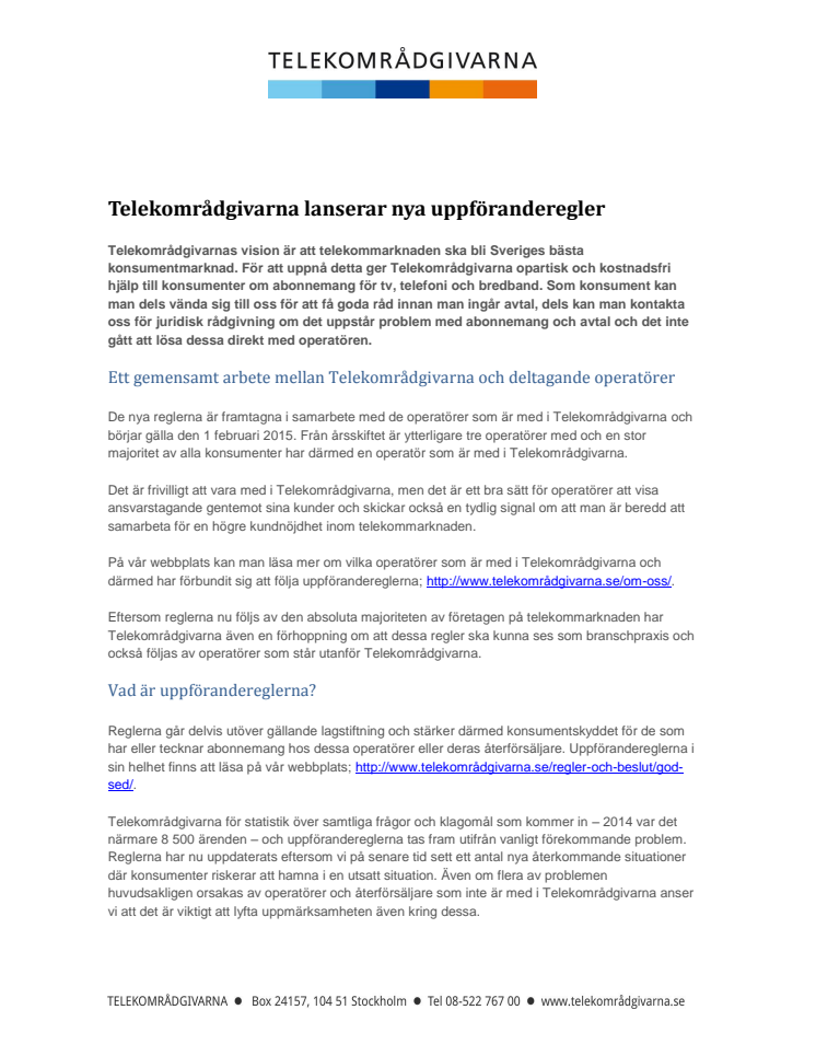 De nya reglerna är framtagna i samarbete med de operatörer som är med i Telekområdgivarna och börjar gälla den 1 februari 2015. Det är frivilligt att vara med i Telekområdgivarna, men det är ett bra sätt för operatörer att visa ansvarstagande gentemot sina kunder och skickar en tydlig signal om att man är beredd att samarbeta för en högre kundnöjdhet inom telekommarknaden.