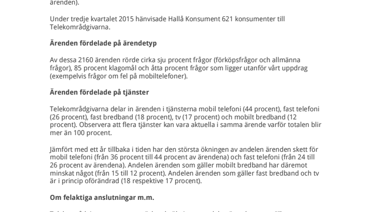 Under tredje kvartalet 2015 fick Telekområdgivarna in 2160 ärenden. Det är en ökning med nästan nio procent jämfört med motsvarande kvartal förra året (1983 ärenden).