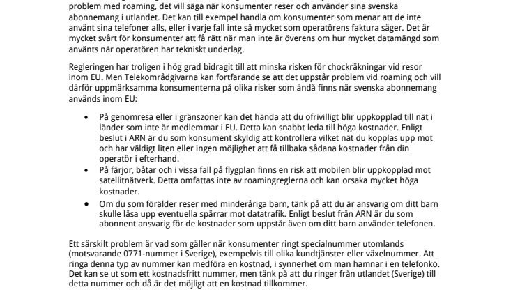 Regleringen har troligen i hög grad bidragit till att minska risken för chockräkningar vid resor inom EU. Men Telekområdgivarna kan fortfarande se att det uppstår problem vid roaming och vill därför uppmärksamma konsumenterna på olika risker som ändå finns när svenska abonnemang används inom EU: