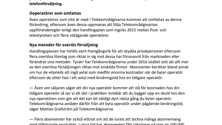 Även operatörer som inte är med i Telekområdgivarna kommer att omfattas av denna förändring, eftersom även dessa uppmanas att följa Telekområdgivarnas uppföranderegler enligt den handlingsplan som ingicks 2015 mellan Post- och telestyrelsen och flera nätägande operatörer.