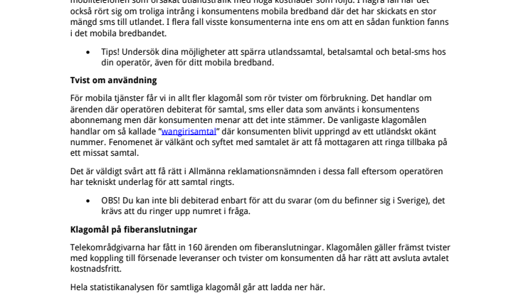 För mobila tjänster får vi in allt fler klagomål som rör tvister om förbrukning. Det handlar om ärenden där operatören debiterat för samtal, sms eller data som använts i konsumentens abonnemang men där konsumenten menar att det inte stämmer. De vanligaste klagomålen handlar om så kallade ”wangirisamtal” där konsumenten blivit uppringd av ett utländskt okänt nummer. Fenomenet är välkänt och syftet med samtalet är att få mottagaren att ringa tillbaka på ett missat samtal.