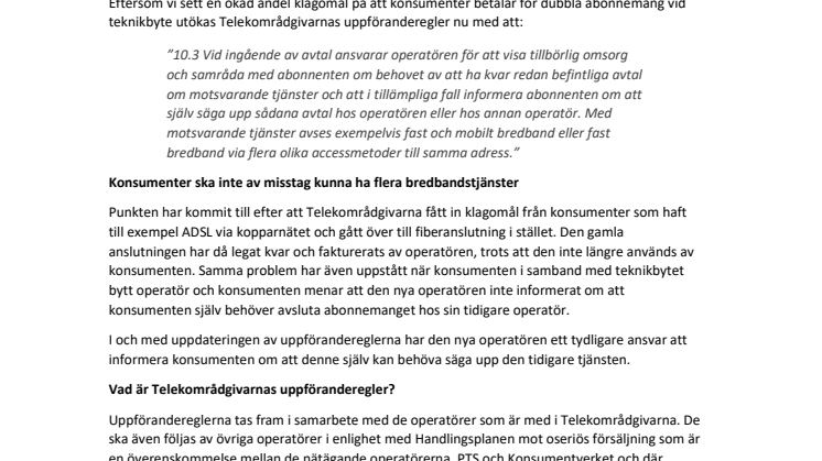 ”10.3 Vid ingående av avtal ansvarar operatören för att visa tillbörlig omsorg och samråda med abonnenten om behovet av att ha kvar redan befintliga avtal om motsvarande tjänster och att i tillämpliga fall informera abonnenten om att själv säga upp sådana avtal hos operatören eller hos annan operatör. Med motsvarande tjänster avses exempelvis fast och mobilt bredband eller fast bredband via flera olika accessmetoder till samma adress.”