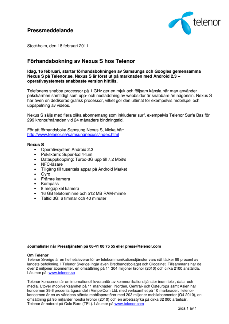 Idag, 16 februari, startar förhandsbokningen av Samsungs och Googles gemensamma Nexus S på Telenor.se. Nexus S är först ut på marknaden med Android 2.3 – operativsystemets snabbaste version hittills.