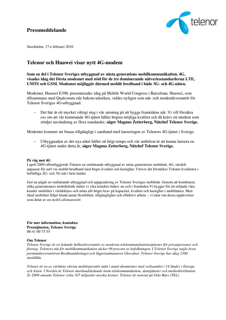 Som en del i Telenor Sveriges utbyggnad av nästa generations mobilkommunikation, 4G, visades idag det första modemet med stöd för de tre dominerande nätverksstandarderna LTE, UMTS och GSM. Modemet möjliggör därmed mobilt bredband i både 3G- och 4G-näten.