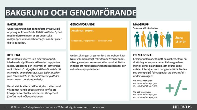 Undersökningen är genomförd via webbenkät i Novus slumpmässigt rekryterade Sverigepanel, vilket garanterar representativa resultat. Detta innebär att resultaten är generaliserbara till den aktuella målpopulationen. Antal respondenter var 1059 st och svaren inhämtades mellan 27 september – 3 oktober 2024.