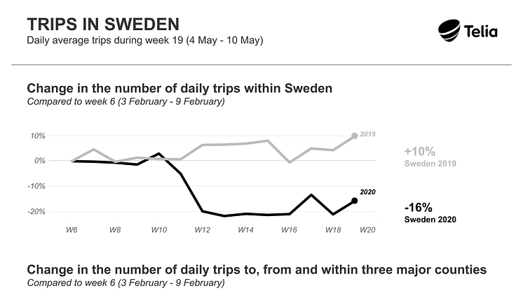 Telias analys av hur grupper av människor rörde sig från 4 maj till 10 maj jämfört med veckan innan visar att resandet i snitt ökade med sju procent. Stockholm och Gotland ökade mest (+10%), följda av Uppsala och Södermanland (+8%). Hallands län hade den minsta ökningen (+2%), följt av Dalarna, Jämtland och Värmland (+3%).