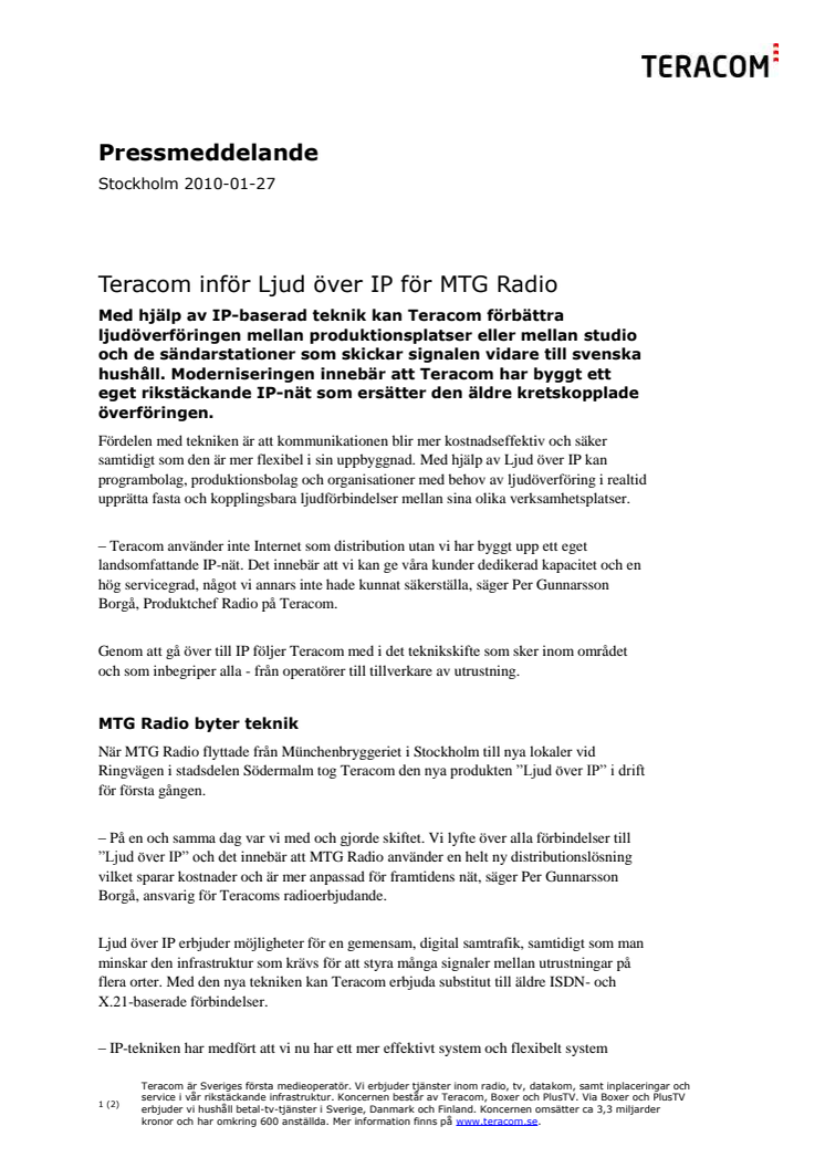 Med hjälp av IP-baserad teknik kan Teracom förbättra ljudöverföringen mellan produktionsplatser eller mellan studio och de sändarstationer som skickar signalen vidare till svenska hushåll. Moderniseringen innebär att Teracom har byggt ett eget rikstäckande IP-nät som ersätter den äldre kretskopplade överföringen.
