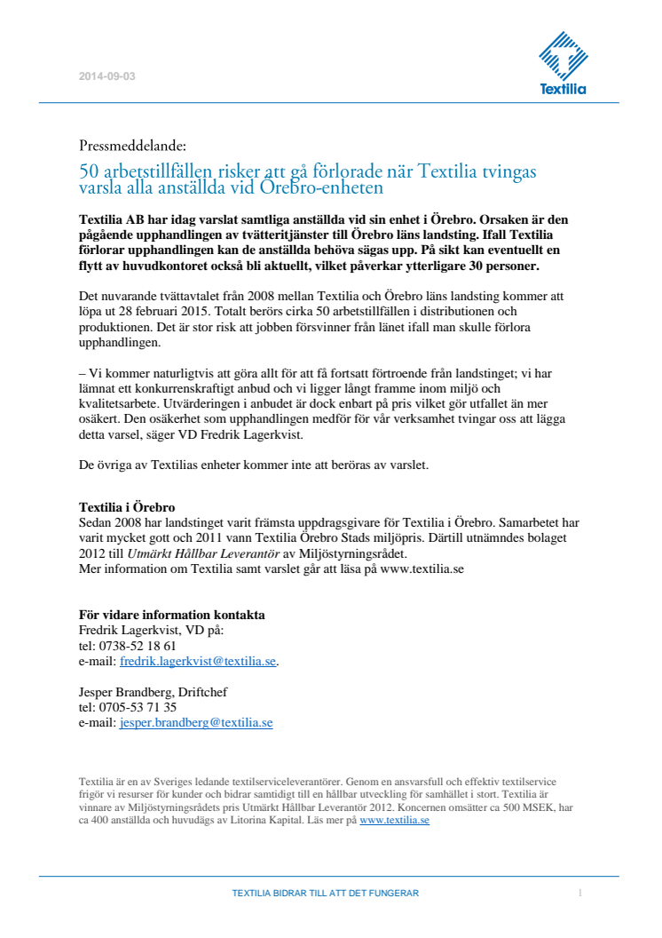 Textilia AB har idag varslat samtliga anställda vid sin enhet i Örebro. Orsaken är den pågående upphandlingen av tvätteritjänster till Örebro läns landsting. Ifall Textilia förlorar upphandlingen kan de anställda behöva sägas upp. På sikt kan eventuellt en flytt av huvudkontoret också bli aktuellt, vilket påverkar ytterligare 30 personer.