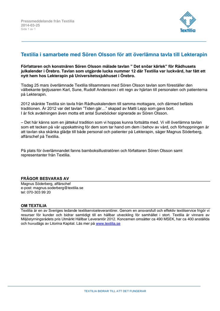 Författaren och barnboksillustratören Sören Olsson målade tavlan ” Det snöar kärlek” för Rådhusets julkalender i Örebro. Tavlan som utgjorde lucka nummer 12 där Textilia var luckvärd, har fått ett nytt hem hos Lekterapin på Universitetssjukhuset i Örebro.