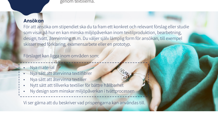 För att ansöka om stipendiet ska du ge ett konkret och relevant förslag på hur textilserviceföretag kan minska sin miljöpåverkan genom textilier. Förslaget bör vara så pass detaljerat och genomtänkt att det skulle kunna vara genomförbart. Du kan själv välja lämplig form för ansökan, till exempel skisser med förklaring, examensarbete eller en prototyp. Förslaget kan ligga inom områden som: