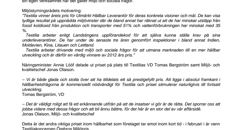 Textilia arbetar drivande med miljö och sociala frågor för att utmana marknaden till en mer hållbar utveckling och är därför en värdig vinnare av 2012 års pris.”