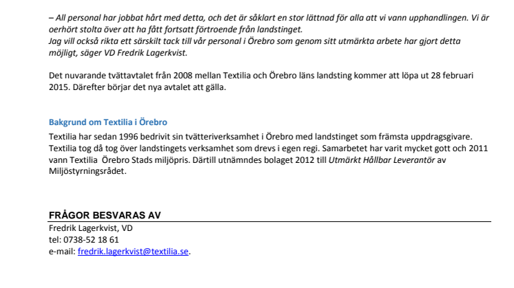 Det nuvarande tvättavtalet från 2008 mellan Textilia och Örebro läns landsting kommer att löpa ut 28 februari 2015. Därefter börjar det nya avtalet att gälla.