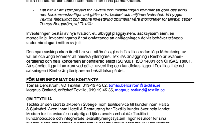 Textilia investerar närmare 50 miljoner kronor i sin textilserviceanläggning i Rimbo. Investeringen, som förnyar stora delar av maskinparken, är nödvändig för att skapa bästa möjliga förutsättningar i det nya kontrakt med SLL, Stockholms Läns Landsting, som vanns i januari. Trots att SLLs upphandling ännu inte är helt klar väljer Textilia att ändå genomföra investeringen.