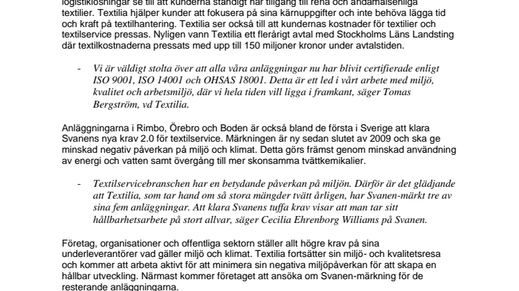 Företag, organisationer och offentliga sektorn ställer allt högre krav på sina underleverantörer vad gäller miljö och klimat. Textilia fortsätter sin miljö- och kvalitetsresa och kommer att arbeta aktivt för att minimera sin negativa miljöpåverkan för att skapa en hållbar utveckling. Närmast kommer företaget att ansöka om Svanen-märkning för de resterande anläggningarna.