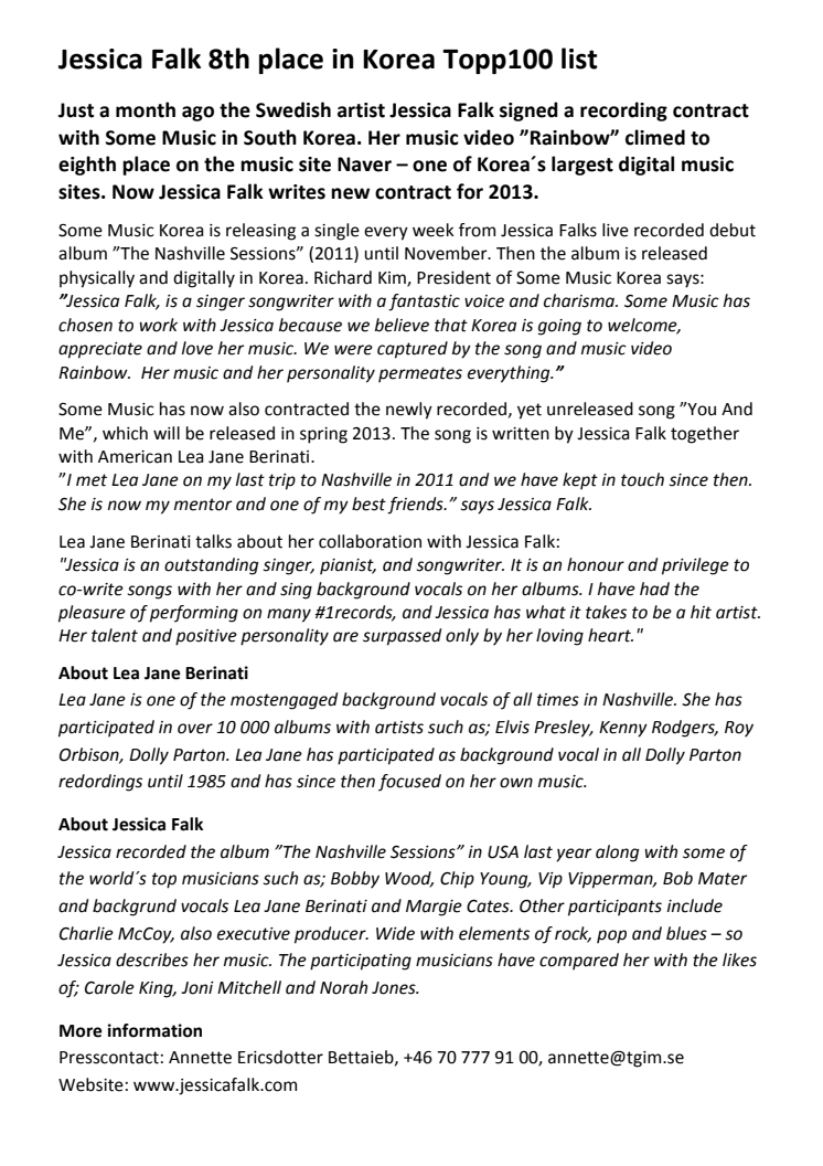Jessica Falk´s music video "Rainbow" climbed to eighth place on the music site Naver - one of Korea's largest digital music sites. Now Jessica Falk writes a new contract for 2013 with Some Music Korea. Together with legendary American Lea Jane Berinati, writes the Swedish singer new songs recorded with some of the world's top musicians in Nashville. www.jessicafalk.com