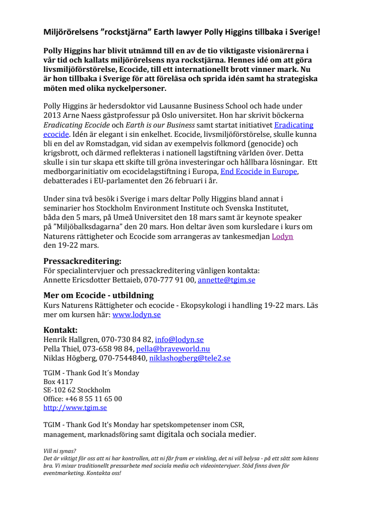 Polly Higgins är tillbaka ii Sverige som keynote speaker på Miljöbalksdagarna och med en fylld agenda av föreläsningar, möten med några av Sveriges främsta nyckelpersoner inom miljörörelsen och regeringen samt som kursledare inom Naturens Rättigheter och Ecocide. Hon har utsetts till 1 av 10 av de viktigaste visionärerna i vår tid och kallats miljörörelsens nya rockstjärna.