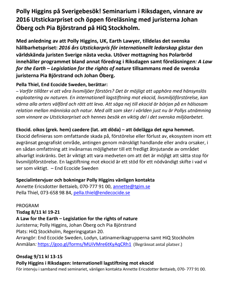Polly Higgins på Sverigebesök! Seminarium i Riksdagen, vinnare av 2016 Utstickarpriset och öppet föredrag med juristerna Johan Öberg och Pia Björstrand på HiQ Stockholm