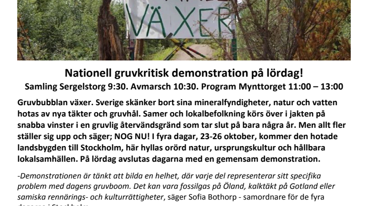 Gruvbubblan växer. Sverige skänker bort sina mineralfyndigheter, natur och vatten hotas av nya täkter och gruvhål. Samer och lokalbefolkning körs över i jakten på snabba vinster i en gruvlig återvändsgränd som tar slut på bara några år. Men allt fler ställer sig upp och säger; NOG NU! I fyra dagar, 23-26 oktober, kommer den hotade landsbygden till Stockholm, här hyllas orörd natur, ursprungskultur och hållbara lokalsamhällen. På lördag avslutas dagarna med en gemensam demonstration.