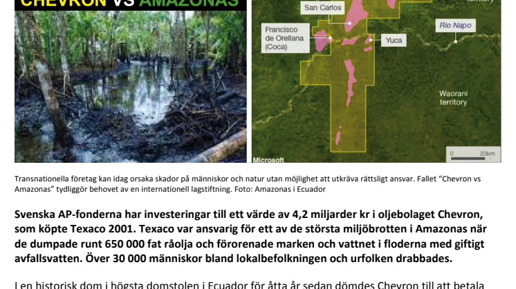 Svenska AP-fonderna har investeringar till ett värde av 4,2 miljarder kr i oljebolaget Chevron, som köpte Texaco 2001. Texaco var ansvarig för ett av de största miljöbrotten i Amazonas när de dumpade runt 650 000 fat råolja och förorenade marken och vattnet i floderna med giftigt avfallsvatten. Över 30 000 människor bland lokalbefolkningen och urfolken drabbades.