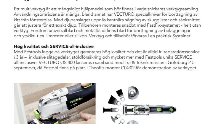 Med Festools logga på verktyget garanteras hög kvalitet och det är alltid fri reparationsservice i 3 år – inklusive slitagedelar, stöldförsäkring och mycket mer med Festools unika SERVICE all-inclusive. VECTURO OS400 lanseras i samband med Trä & Teknik mässan i Göteborg 2-5 september, då Festool finns på plats i Theofils monter C04:02 för demonstration av verktyget.