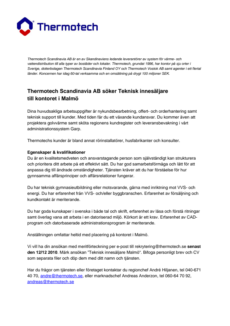 Thermotech söker Teknisk innesäljare till kontoret i Malmö