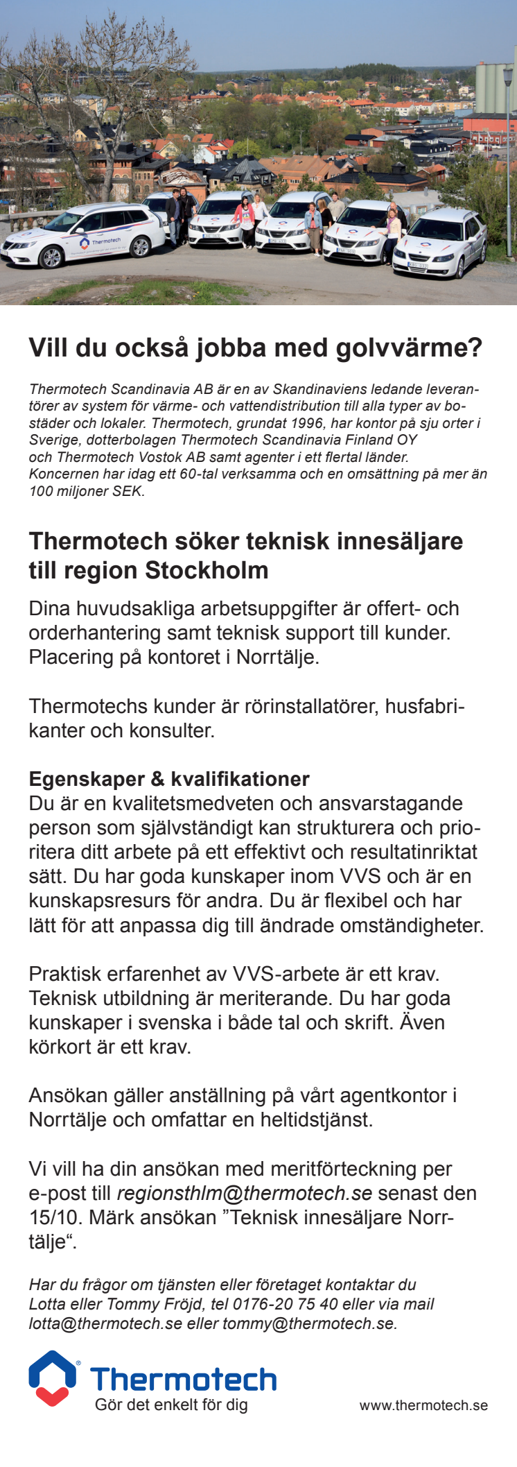 Vi vill ha din ansökan med meritförteckning per e-post till regionsthlm@thermotech.se senast den 15/10. Märk ansökan ”Teknisk innesäljare Norrtälje“.