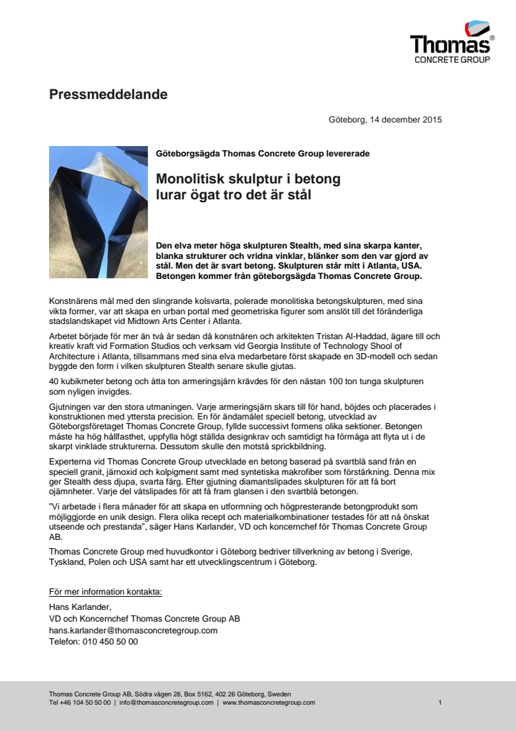 Den elva meter höga skulpturen Stealth, med sina skarpa kanter, blanka strukturer och vridna vinklar, blänker som den var gjord av stål. Men det är svart betong. Skulpturen står mitt i Atlanta, USA. Betongen kommer från göteborgsägda Thomas Concrete Group.