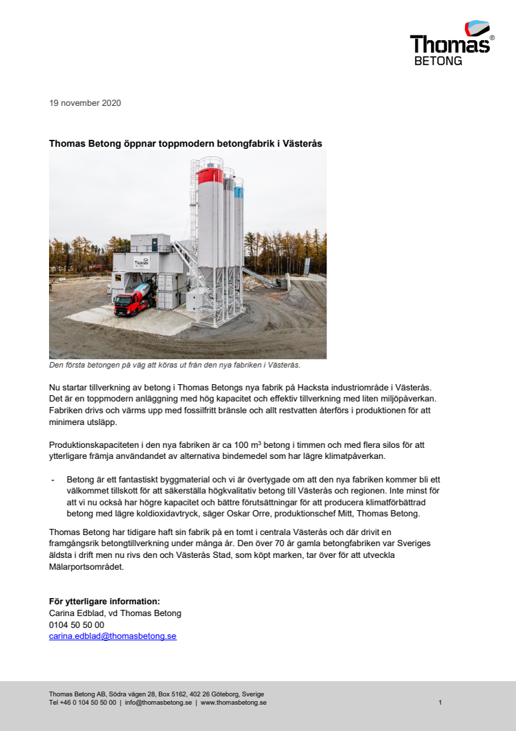 Nu startar tillverkning av betong i Thomas Betongs nya fabrik på Hacksta industriområde i Västerås. Det är en toppmodern anläggning med hög kapacitet och effektiv tillverkning med liten miljöpåverkan. Fabriken drivs och värms upp med fossilfritt bränsle och allt restvatten återförs i produktionen för att minimera utsläpp.
