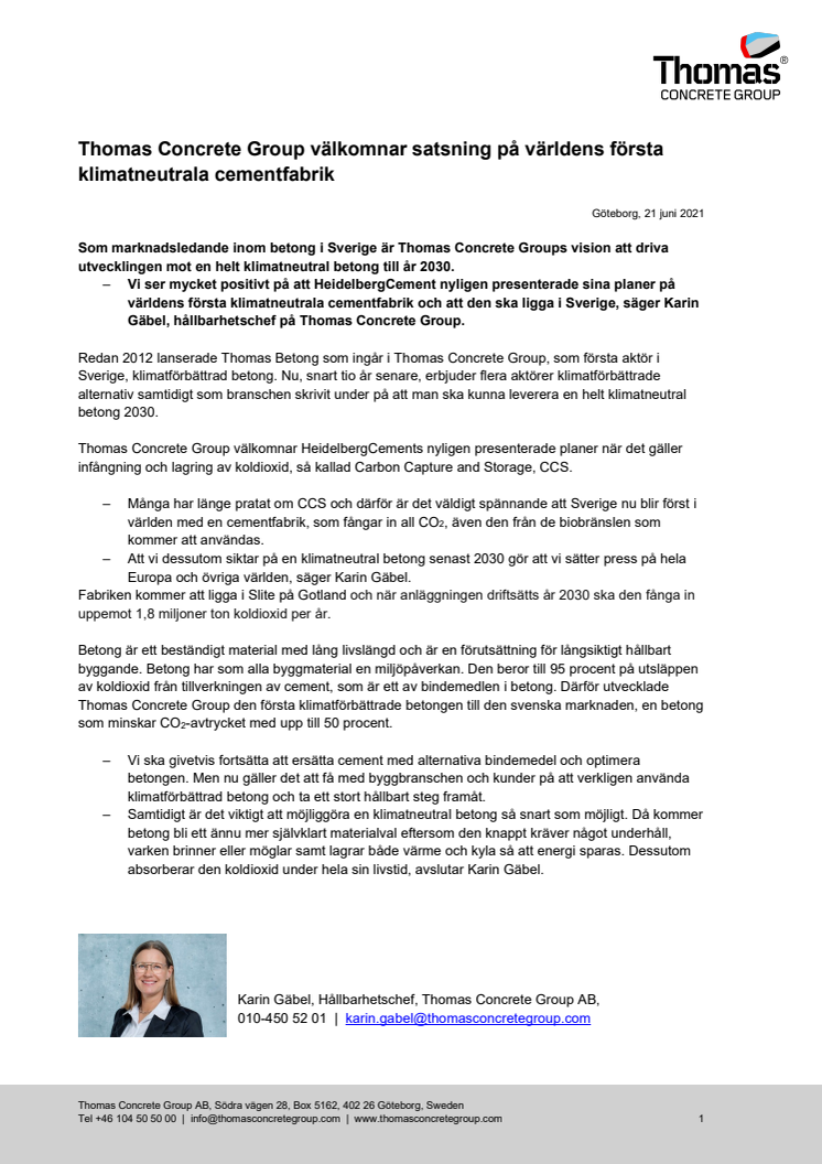 – Vi ser mycket positivt på att HeidelbergCement nyligen presenterade sina planer på världens första klimatneutrala cementfabrik och att den ska ligga i Sverige, säger Karin Gäbel, hållbarhetschef på Thomas Concrete Group.