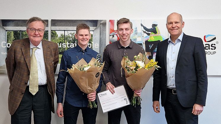Nyexaminerade civilingenjörerna Benjamin Pettersson och William Mjörnestål fick ta emot stipendium av Familjen Thomas Forskningsstiftelse. Till vänster Finn Johnsson, styrelseordförande i Familjen Thomas Forskningsstiftelse och till höger Hans Karlander, VD Thomas Concrete Group (foto: Thomas Concrete Group).