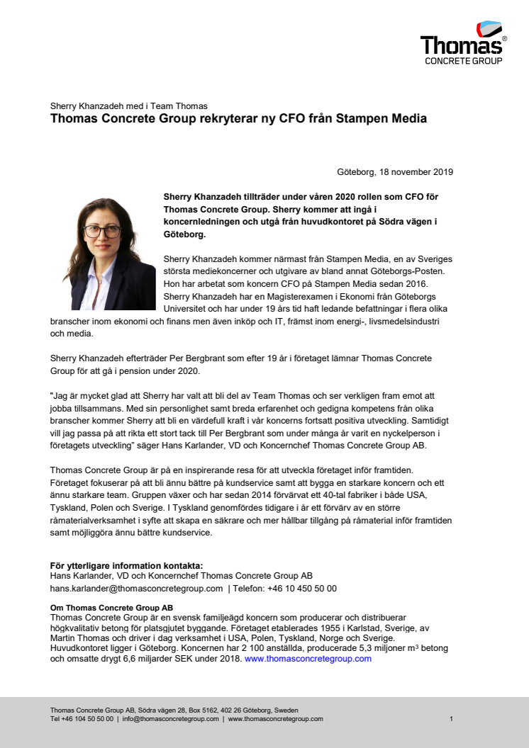 "Jag är mycket glad att Sherry har valt att bli del av Team Thomas och ser verkligen fram emot att jobba tillsammans. Med sin personlighet samt breda erfarenhet och gedigna kompetens från olika branscher kommer Sherry att bli en värdefull kraft i vår koncerns fortsatt positiva utveckling. Samtidigt vill jag passa på att rikta ett stort tack till Per Bergbrant som under många år varit en nyckelperson i företagets utveckling” säger Hans Karlander, VD och Koncernchef Thomas Concrete Group AB.