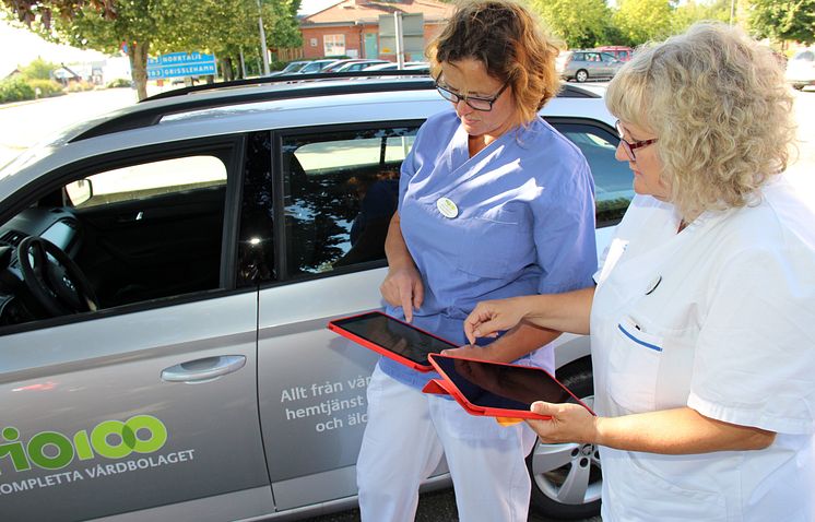 Distriktssköterskorna Marie Sjöblom och Anna Aleflod på Väddö vårdcentral har alltid med sig sina läsplattor när de ska göra hembesök.