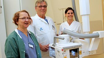Bilden: Röntgensjuksköterska Ritva Kaasalainen, överläkare Peter Svozil och enhetschef Maria Mellqvist vid den nya röntgenkameran.
