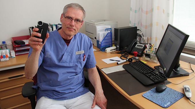 – Med teledermatoskopi skickas bilder via en mobilapp till en server på hudkliniken på Karolinska universitetssjukhuset. Där görs en så kallad ”tvåläkarbedömning” där två olika hudläkare tittar på bilderna. Svaret kommer vanligtvis inom en eller ett par dagar, förklarar Per-Åke Tjärnvall, som är distriktsläkare på Norrtälje norra vårdcentral. Han visar det förstoringsinstrument som fästs direkt på en smartphone.