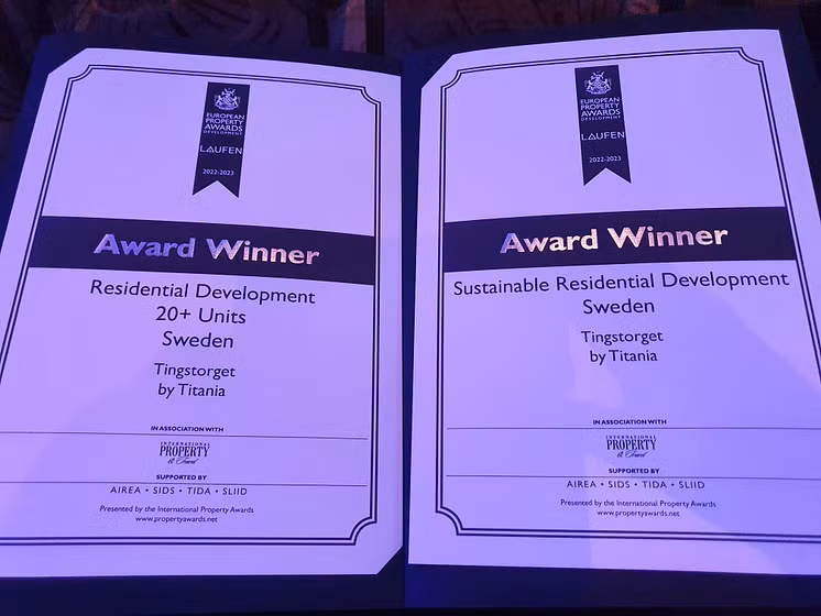 - Vi är mycket stolta över att Tingstorget nu tilldelas ett prestigefyllt internationellt pris i kategorierna Hållbar Bostadsutveckling och Bostadsutveckling för 20+ lägenheter. Vinsterna i de båda kategorierna känns som kvitton på att det hårda arbetet, från alla anställda och övriga inblandade i projektet, lönade sig, säger Titanias VD Einar Janson.
