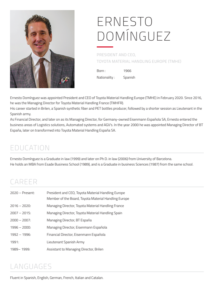 Ernesto Domínguez CV - Ny VD och koncernchef för Toyota Material Handling Europe från 1 april 2020.