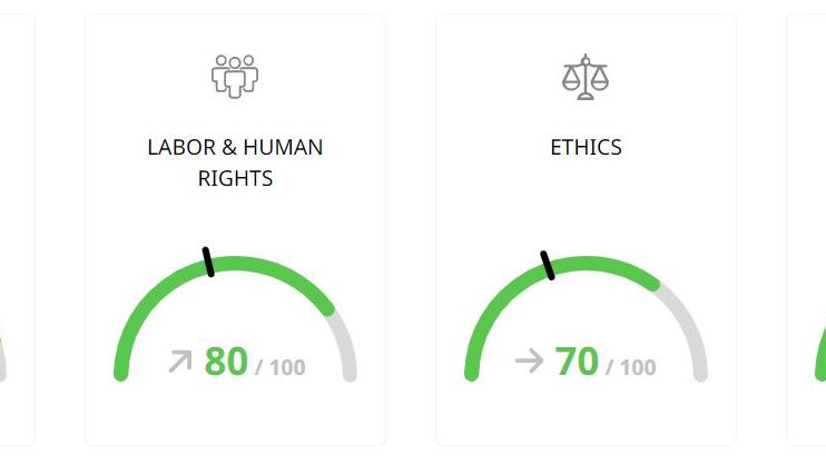 Ecovadis utvärderar fyra olika hållbarhetsområden. Viktningen av varje område varierar där ”Arbetsvillkor och mänskliga rättigheter” är det område som värderas högst. Toyota Material Handling har fått följande betyg på respektive område: