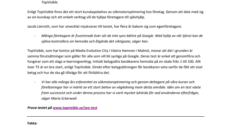 - Ny gratistjänst (SEO-test) för sökmotoroptimering, utvecklat av Malmöföretaget TopVisible