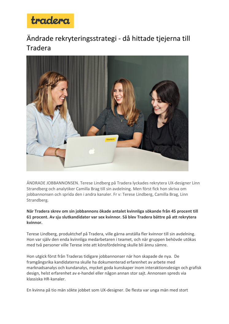 När Tradera skrev om sin jobbannons ökade antalet kvinnliga sökande från 45 procent till 61 procent. Av sju slutkandidater var sex kvinnor. Så blev Tradera bättre på att rekrytera kvinnor.