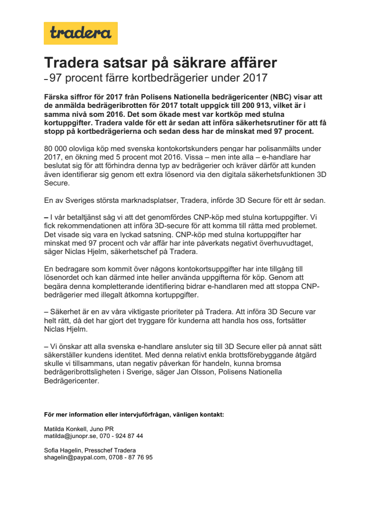 Färska siffror för 2017 från Polisens Nationella bedrägericenter (NBC) visar att de anmälda bedrägeribrotten för 2017 totalt uppgick till 200 913, vilket är i samma nivå som 2016. Det som ökade mest var kortköp med stulna kortuppgifter. Tradera valde för ett år sedan att införa säkerhetsrutiner för att få stopp på kortbedrägerierna och sedan dess har de minskat med 97 procent.